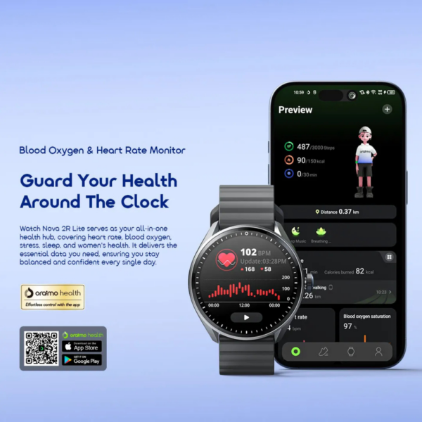 Experience premium style, smart functionality, and long-lasting performance with the Oraimo Watch Nova 2R Lite 1.43″ AMOLED Smart Watch. Designed for modern lifestyles, this smartwatch combines a stunning display, advanced health tracking, and seamless connectivity to keep you in control—whether you’re working, exercising, or relaxing.